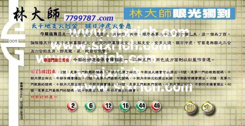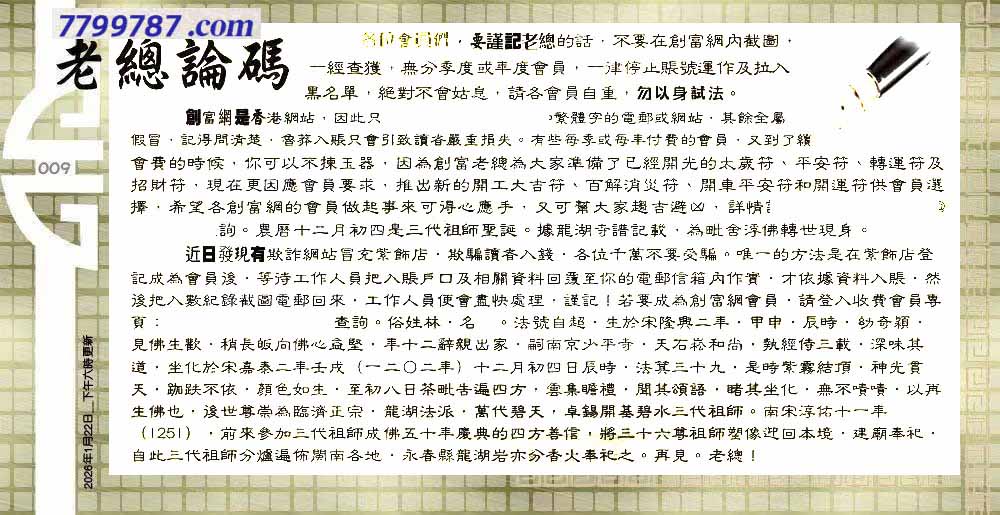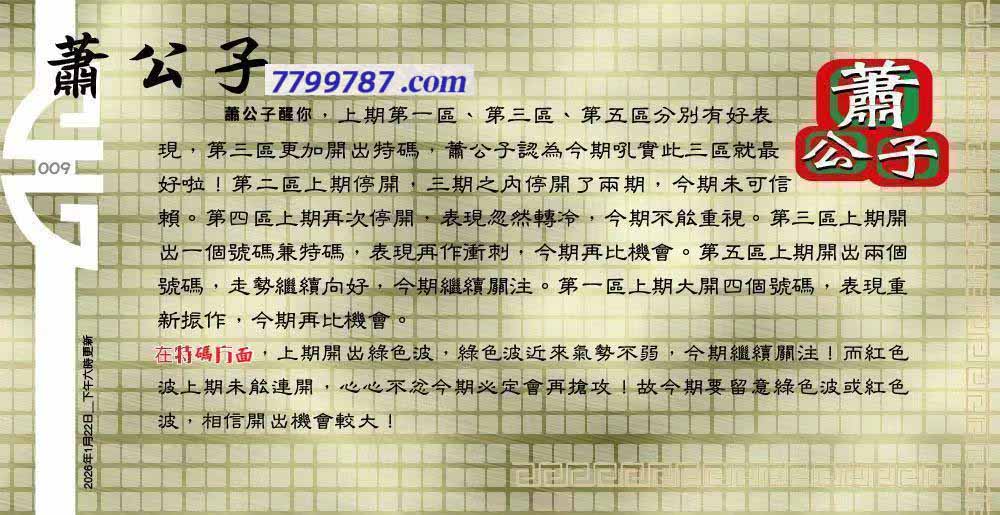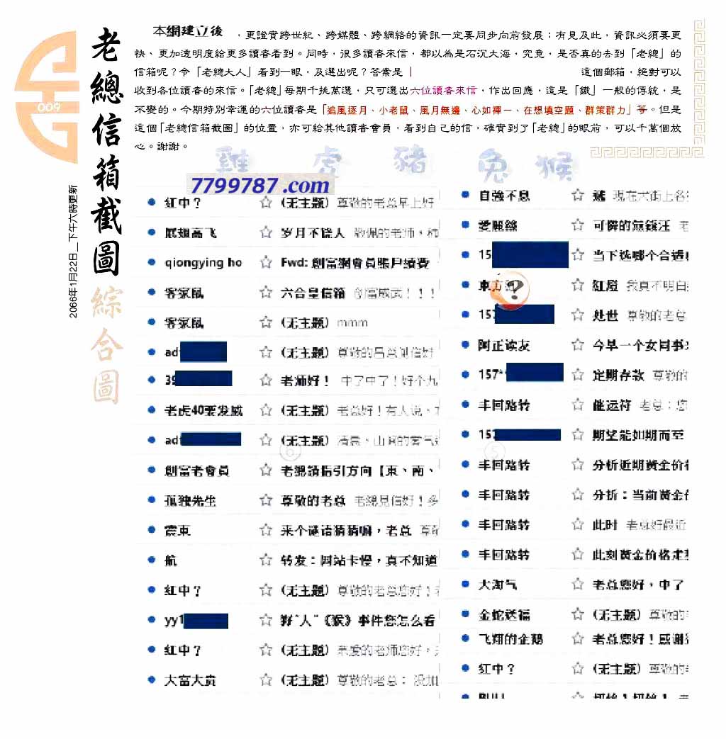 | 主题 :009期:六合皇金句/老总论码/萧公子/林大师/五行夺码/老总信箱截 |