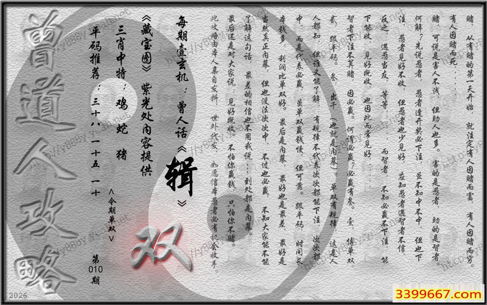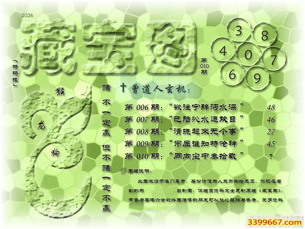 | 主题 :010期藏寶圖 新:同向尘中叁拾载 老:秋槐叶落空宫里 禁:虎 禁:1尾 |
