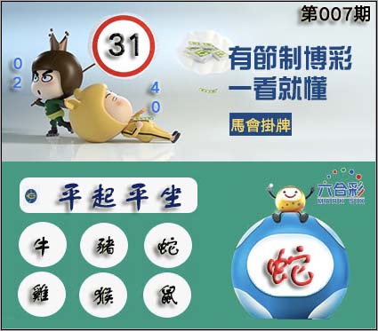 007期正版彩图挂:31 爆:蛇 挂牌成语:平起平坐 挂牌出肖:牛猪蛇鸡猴鼠